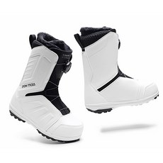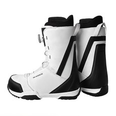 블랙과 화이트 컬러의 스노우보드 부츠로, 겨울철 스키와 레저 스포츠에 적합하며 빠른 착용과 편안한 착용감을 제공하고 발과 발목을 안정적으로 지지하는 동계용 신발