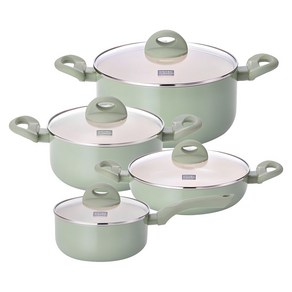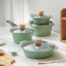 인덕션 사용이 가능한 컬러 냄비 4종 세트로, 편수, 양수, 전골 냄비 구성으로 다양한 요리에 활용할 수 있으며 주방에 생기 있는 그린 색상을 더한 실용적인 제품이다.
